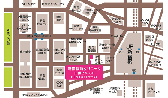 新宿駅前クリニックの泌尿器科は、新宿駅西口から徒歩約1分。ヨドバシカメラ新宿西口本店のすぐそば、ビルの5階にございます。
